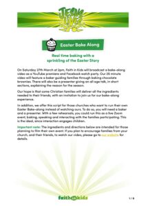 We offer the script of our Easter bake along for those churches who want to run their own instead of watching ours. With a few rehearsals, you could run this as a live (Zoom) event, baking, speaking and interacting with the families participating.