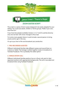 ZOOM EASTER SCRIPT: THERE IS HOPE – This script is a series of short scenes designed to be easily adapted for your setting. You could use adults, children or family groups. Make it your own, and have fun! Zoom backgrounds for each scene are included.