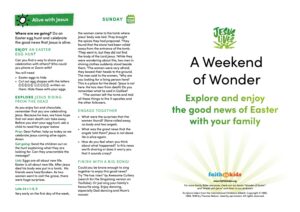 WEEKEND OF WONDER -This resource aims to encourage families to experience and enjoy the good news of Easter – at home, outdoors and with others – and give them confidence that they can open the Bible together at home.