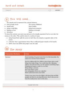 In this assembly we learn that David beat Goliath because he trusted God, and God did everything to let David win. It teaches the children that God always wins. He did with David. He did with Jesus.