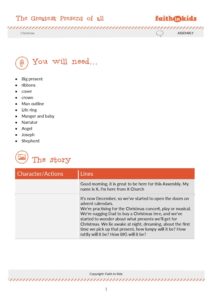 In this assembly Gabriel, Joseph and a Shepherd explain that Jesus is the greatest gift of all. God gave us the baby, who would be the King forever, who is God with us, who came to be a rescuer. And we got the greatest present ever freely. We didn’t deserve for Jesus to come to be born. No one did. But God gave us this gift anyway.