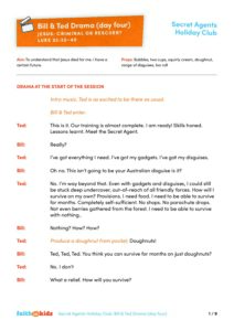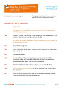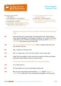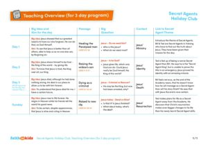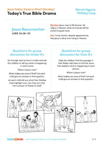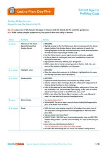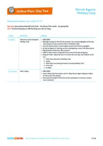 – ‘The Sketch’ videos – our Secret Agent wants to find out who Jesus is. Join him as he shares the day’s Big Question in video one and the Big Answer he has uncovered in video two. These videos can be found on the Faith in Kids Youtube Channel Holiday Club – Secret Agents playlist